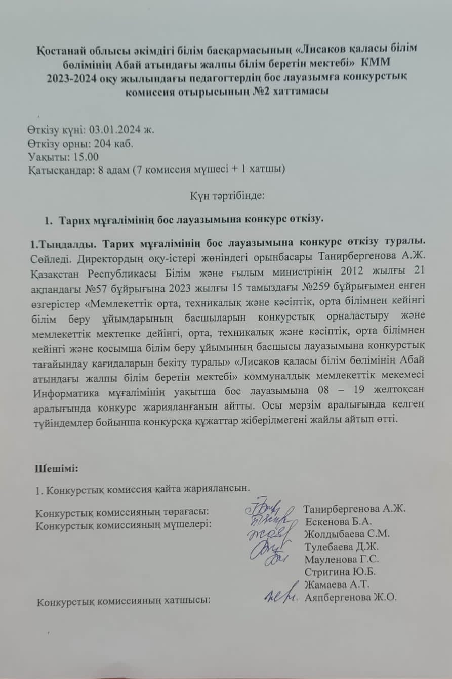 | 1 | Ағылшын тілі мұғалімінің уақытша бос лауазымына конкурс өтті. Хаттама №2 |