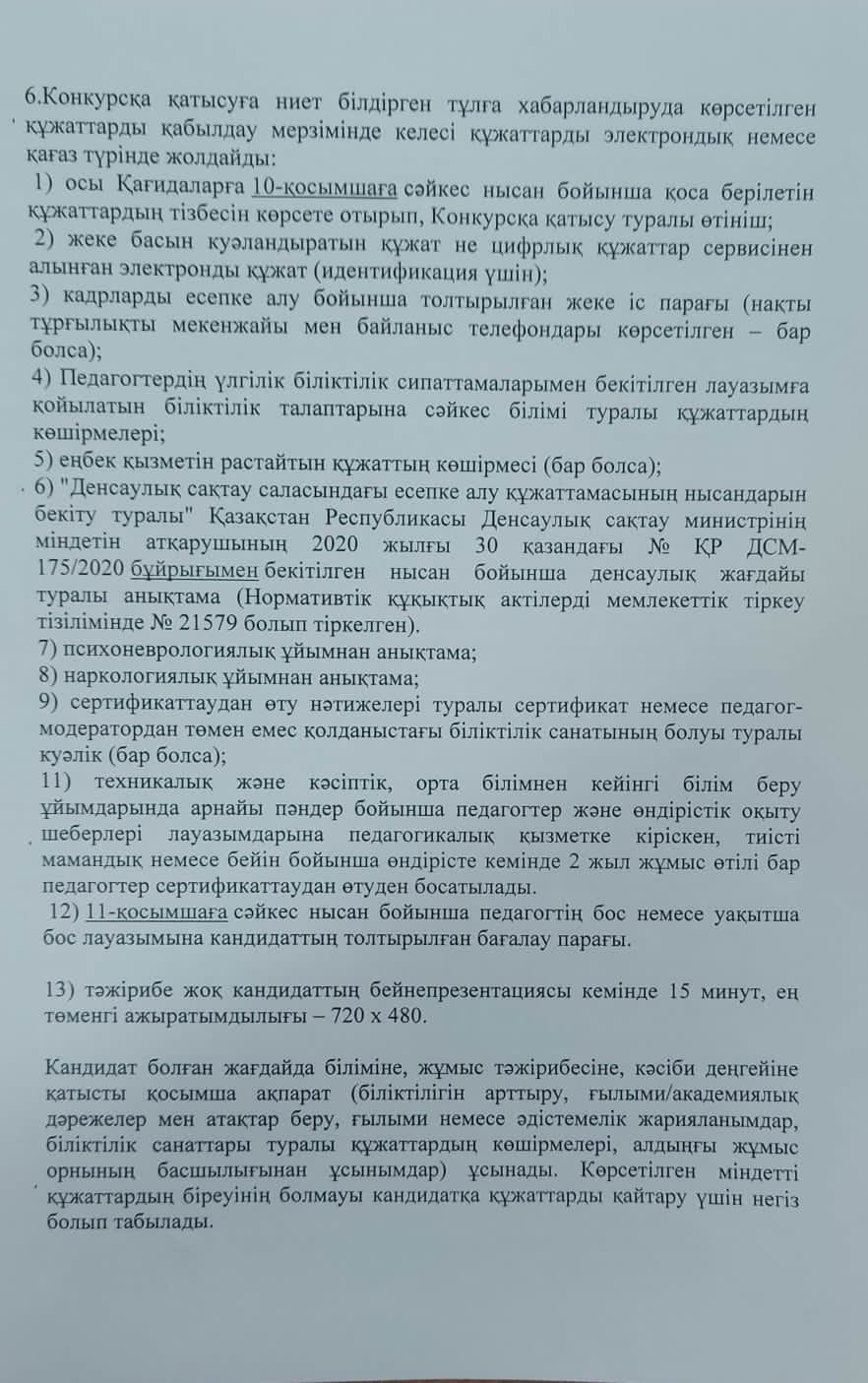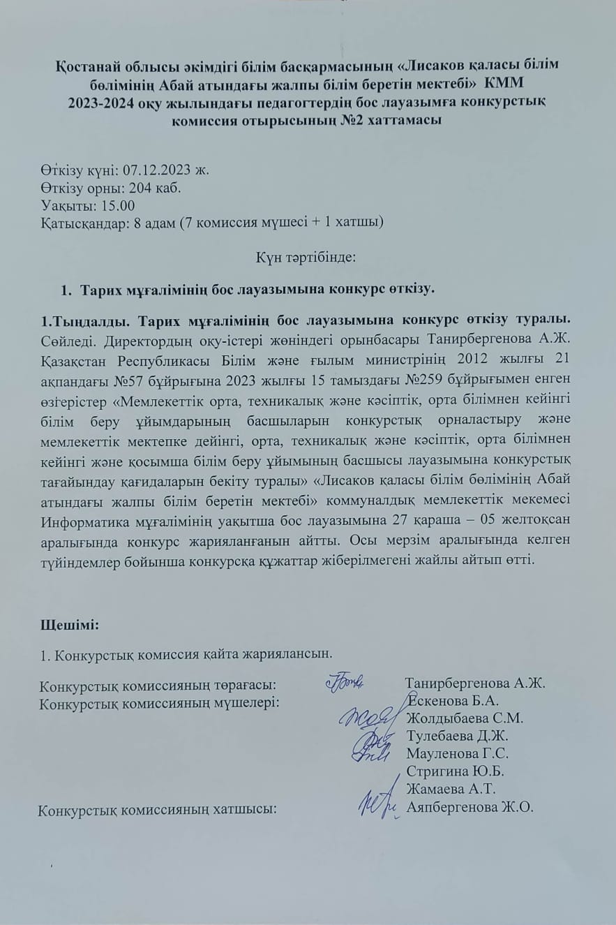 | 1 | Ағылшын тілі мұғалімінің бос лауазымына конкурс өтті. №2 хаттама |
