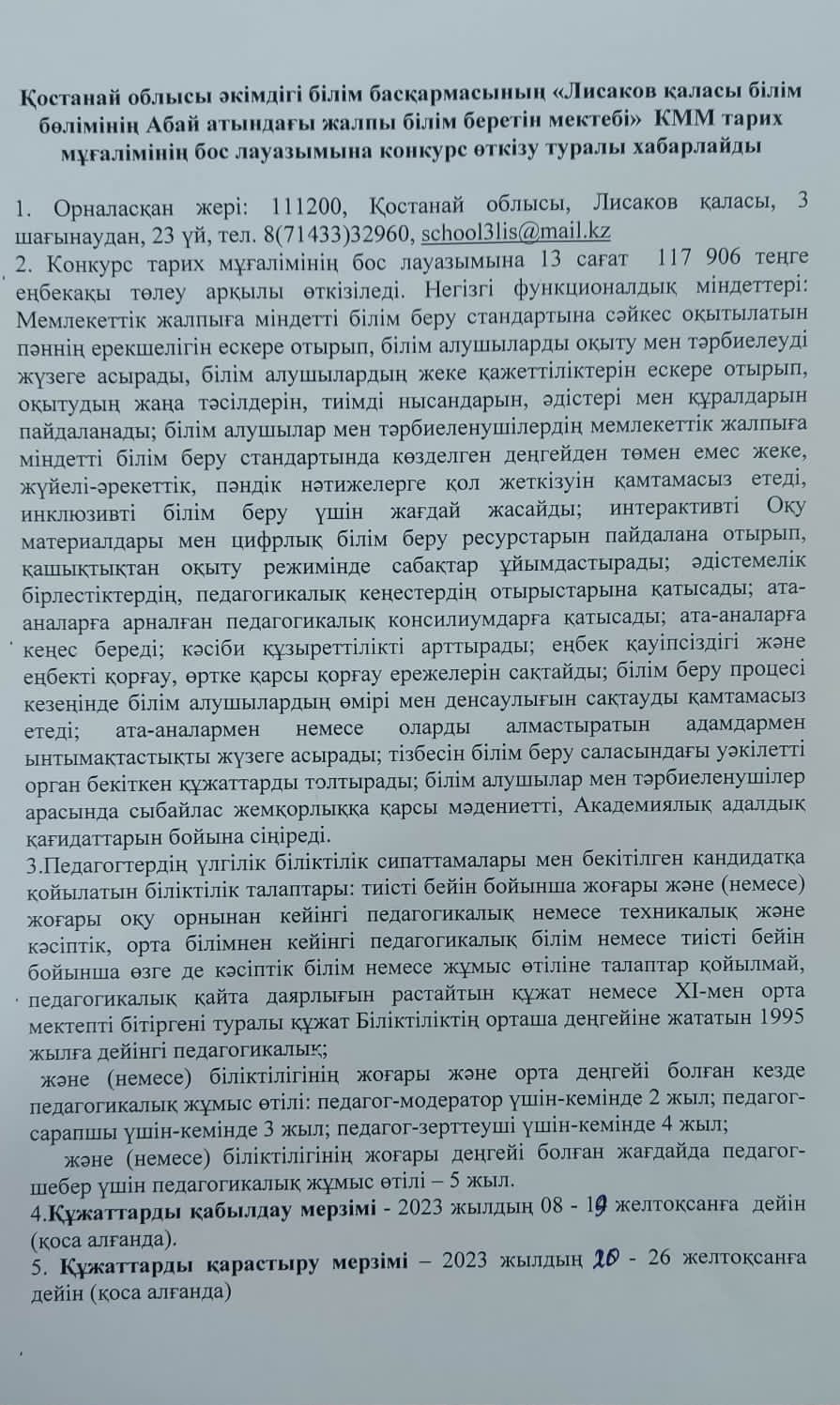 | 1 | Ағылшын тілі мұғалімінің бос лауазымына конкурс жариялау |