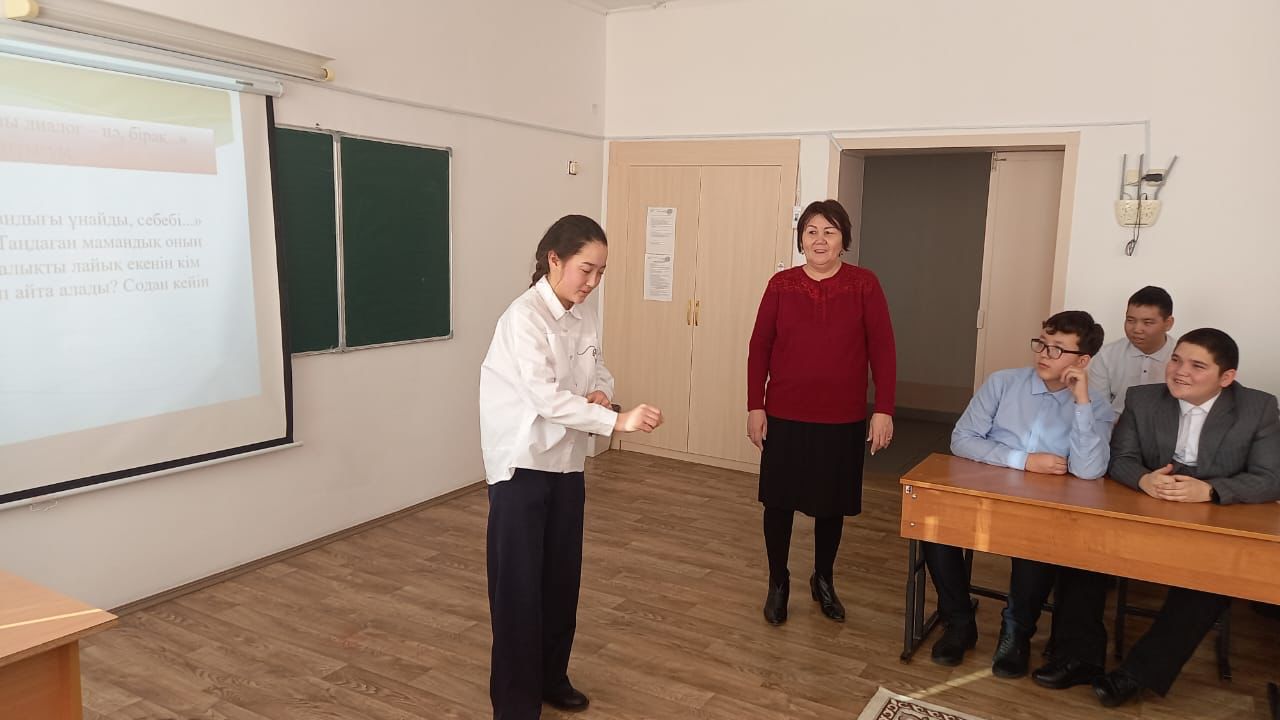 Дөңгелек үстел барысында оқушылар бойындағы қасиеттерді және мінез-құлықтарын анықтау мақсатында Сізге қай мамандық лайық? психологиялық тест және кәзіргі заманға сай «Мамандықты нумерология заңына сәйкес таңдау»атты тақырыпта оқушылар өз таңдауларын жасады.