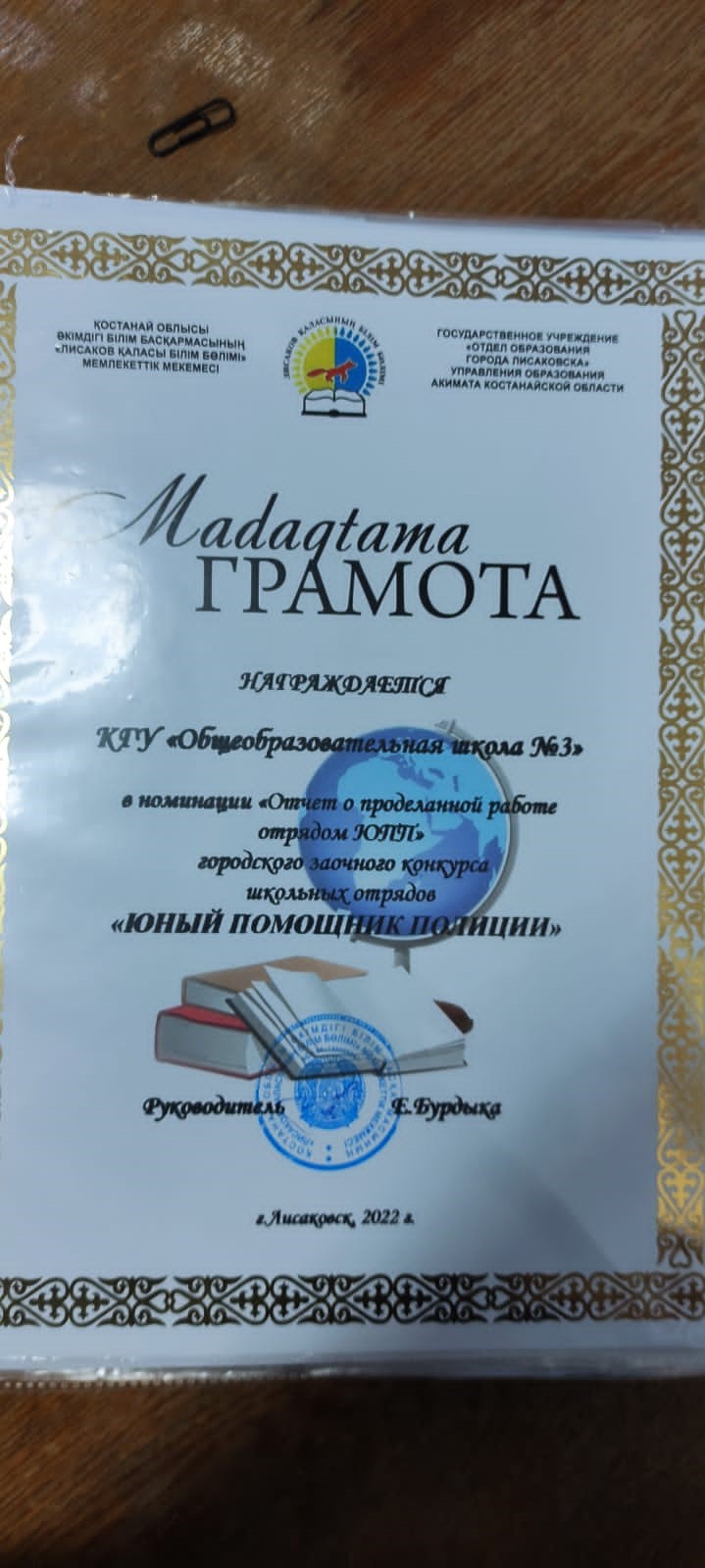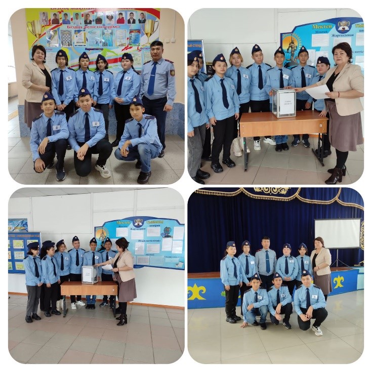 Балалар мен жасөспірімдер арасындағы құқық бұзушылықтардың алдын алу бойынша жұмысты жетілдіру және жандандыру,оқушылардың құқықтық білімінің сапасын арттыру мақсатында 2022-2023 оқу жылы Полицияның жас көмекшілерінің жасағының қалалық байқауы өткізіліп, нәтижесінде біздің мектебіміздін оқушылары «ЖПК жасағының атқарған жұмысы туралы» номинациясына ие болды.