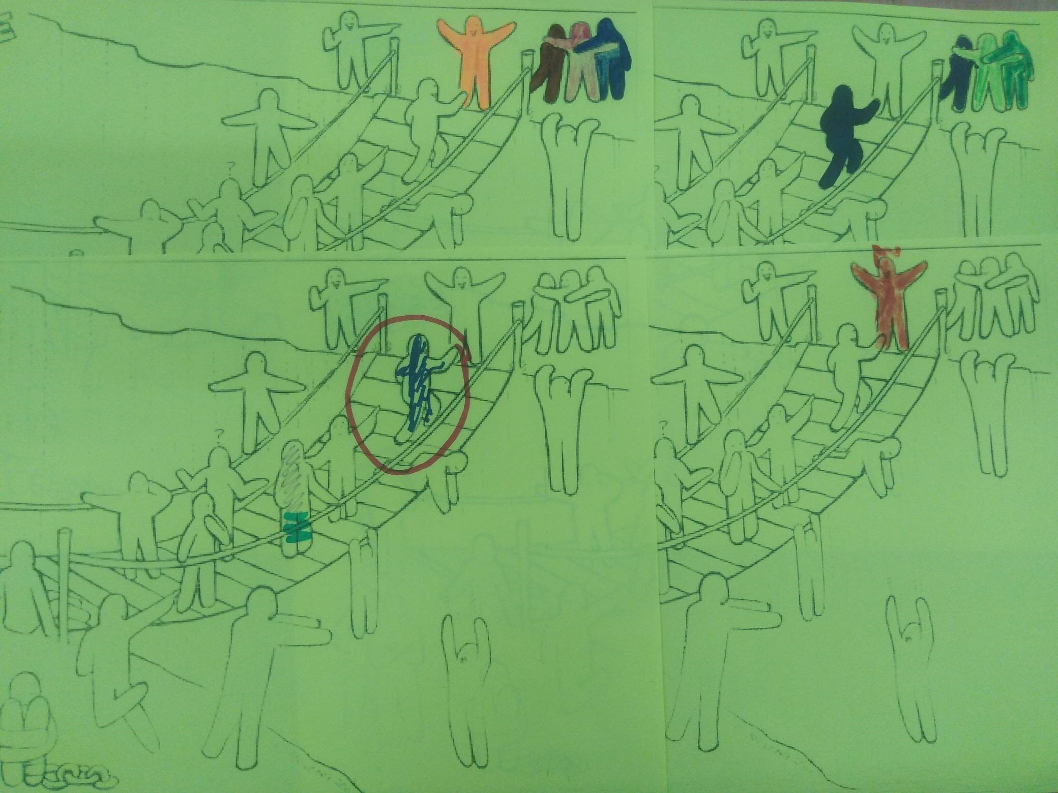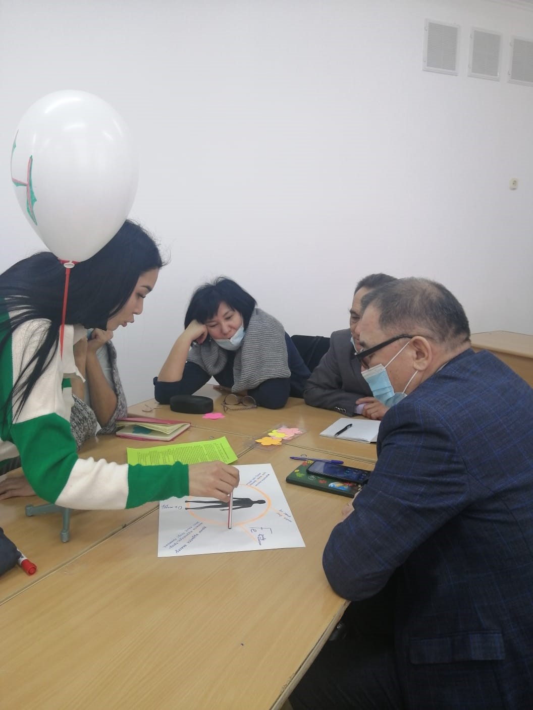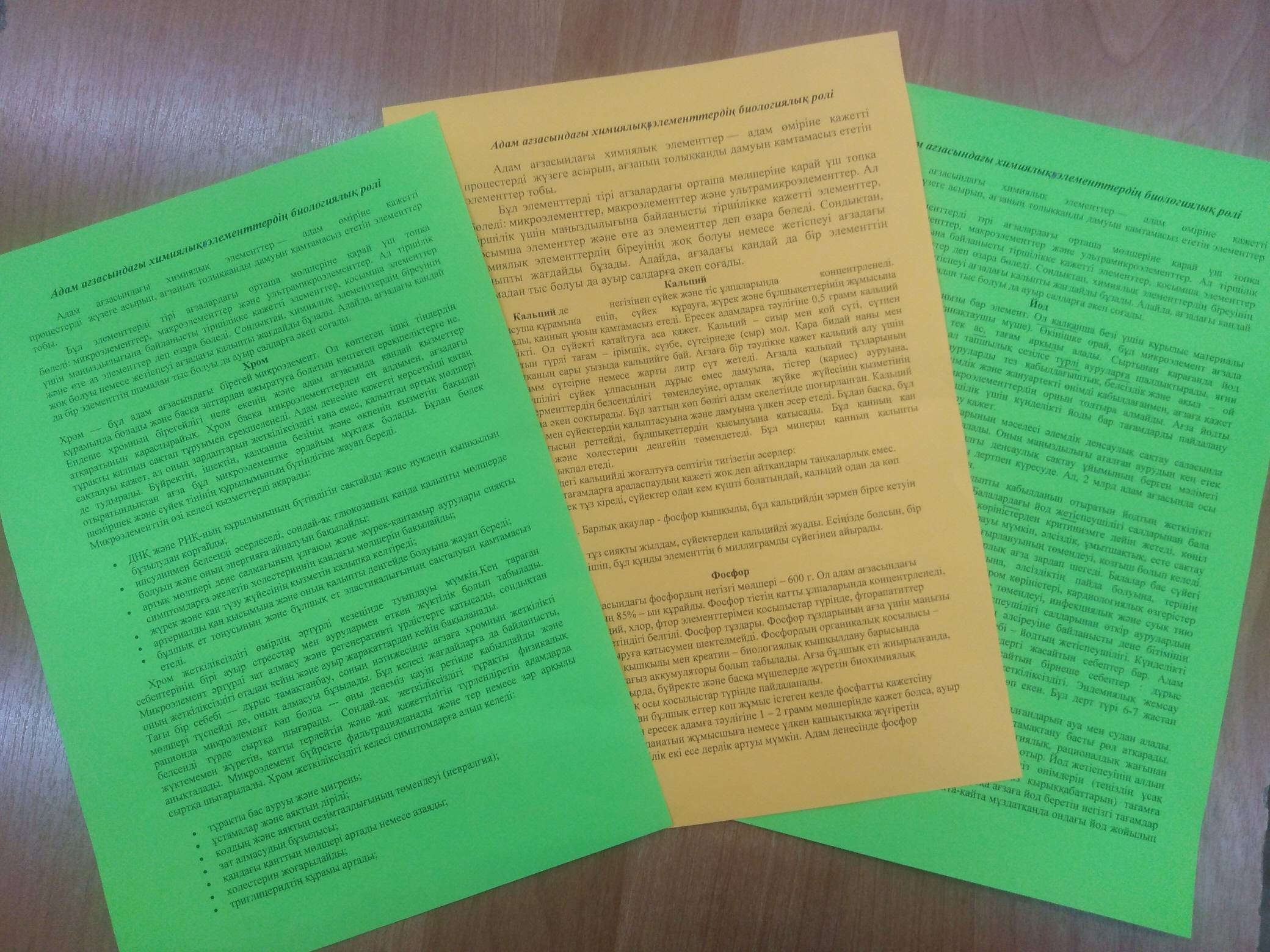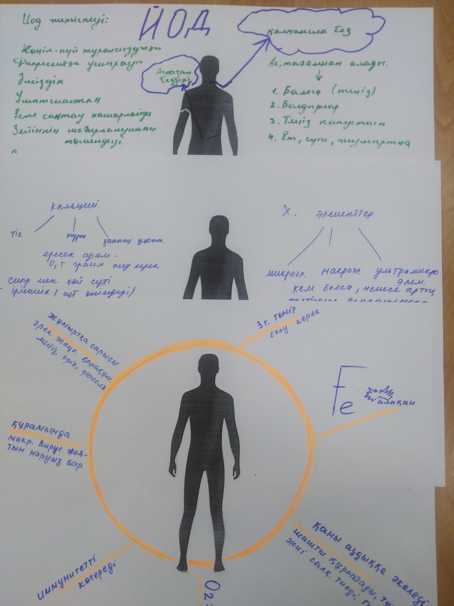 - Әр топқа тапсырма берілді, өз топтарында талдап, сурет не кластер т.б. А3 формат кағазға қорытынды түйіндерін суреттеп, орталарынан баяндамашы шығарып, келесі топқа барып түсіндірді.Осылайша жалғаса берді.