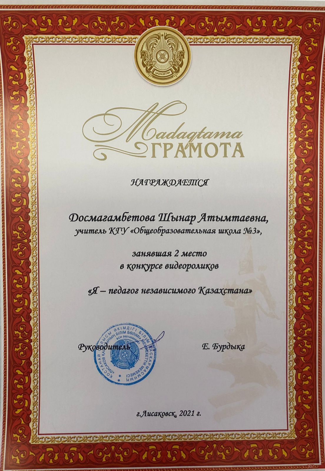 Мектебіміздің жас маман, тарих пәні мұғалімі - Досмагамбетова Шынар Атымтайқызы, Қостанай облысы білім басқармасының әдістемелік кабинеті ұйымдастырған,
