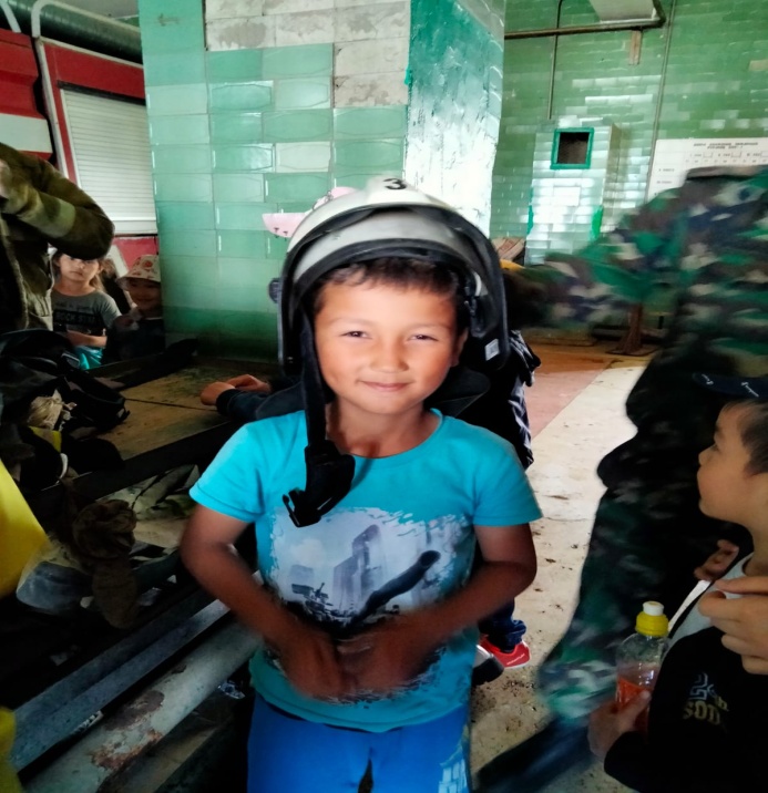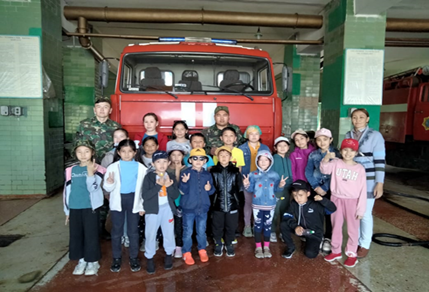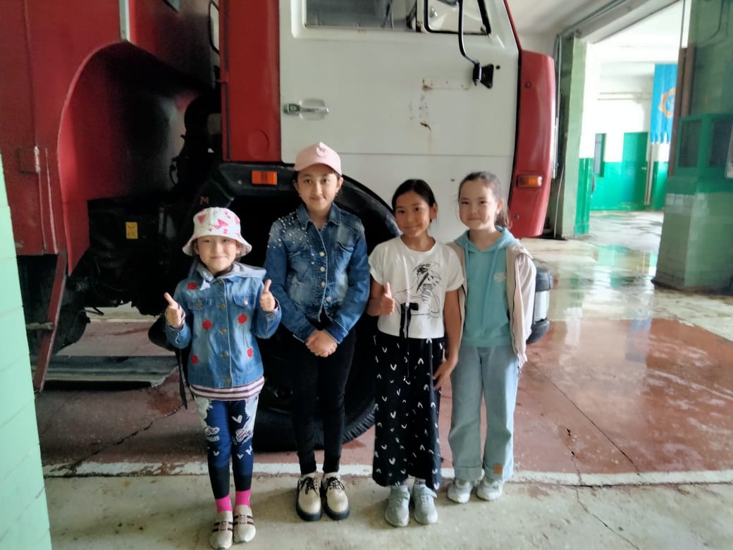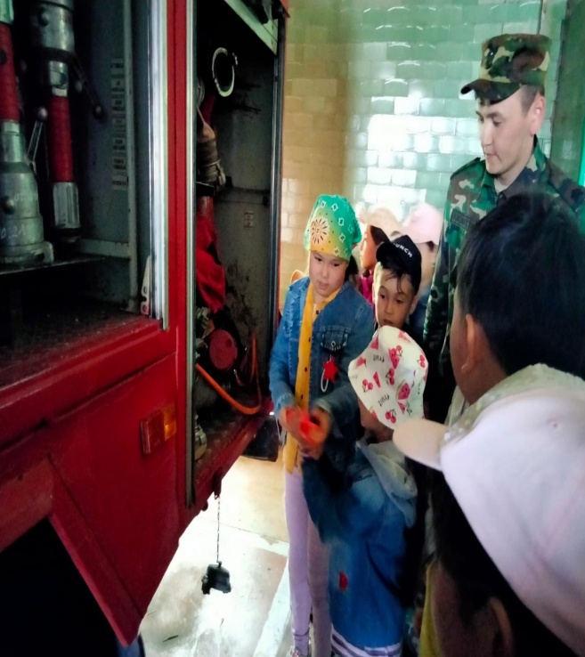 Саяхат барысында балалар өрт сөндіру машиналарымен танысты. Сондай-ақ, шашуға арналған өрт сөндіргіш қондырғылар, құрал-жабдықтар мен қауіпсіздік шараларын, жеке қорғану құралдарына жататын газтұмылдырық, қорғаныш жамылғыштар, арнайы қорғаныш киімдерді қызықтады. Балалар өздері ұстап көріп, өз көздерімен тамашалағандарына қуанып, керекті мағлұматтарды алды.